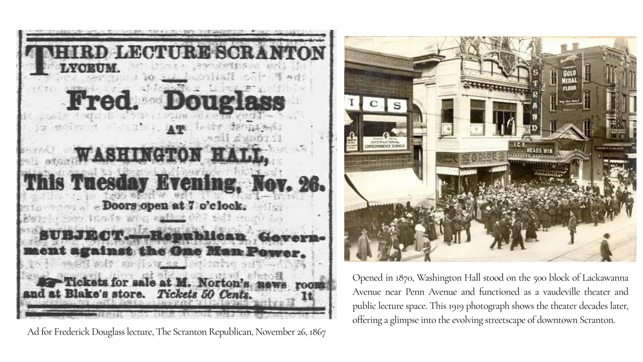Douglass visited Scranton multiple times between the 1860s and 1870s, speaking to packed audiences in a rapidly growing industrial city—one shaped by coal, railroads, immigration, and a small but significant Black population finding its footing in the aftermath of slavery and the Civil War.