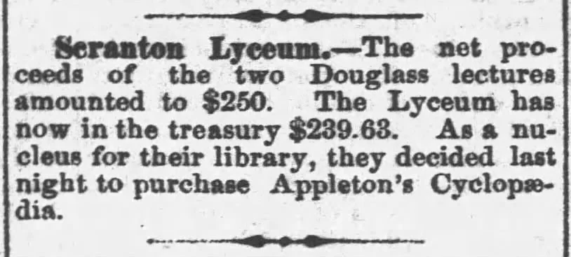 The two Douglass lectures brought in $250 in net proceeds — used to purchase Appleton's Cyclopædia as the foundation of a new library.